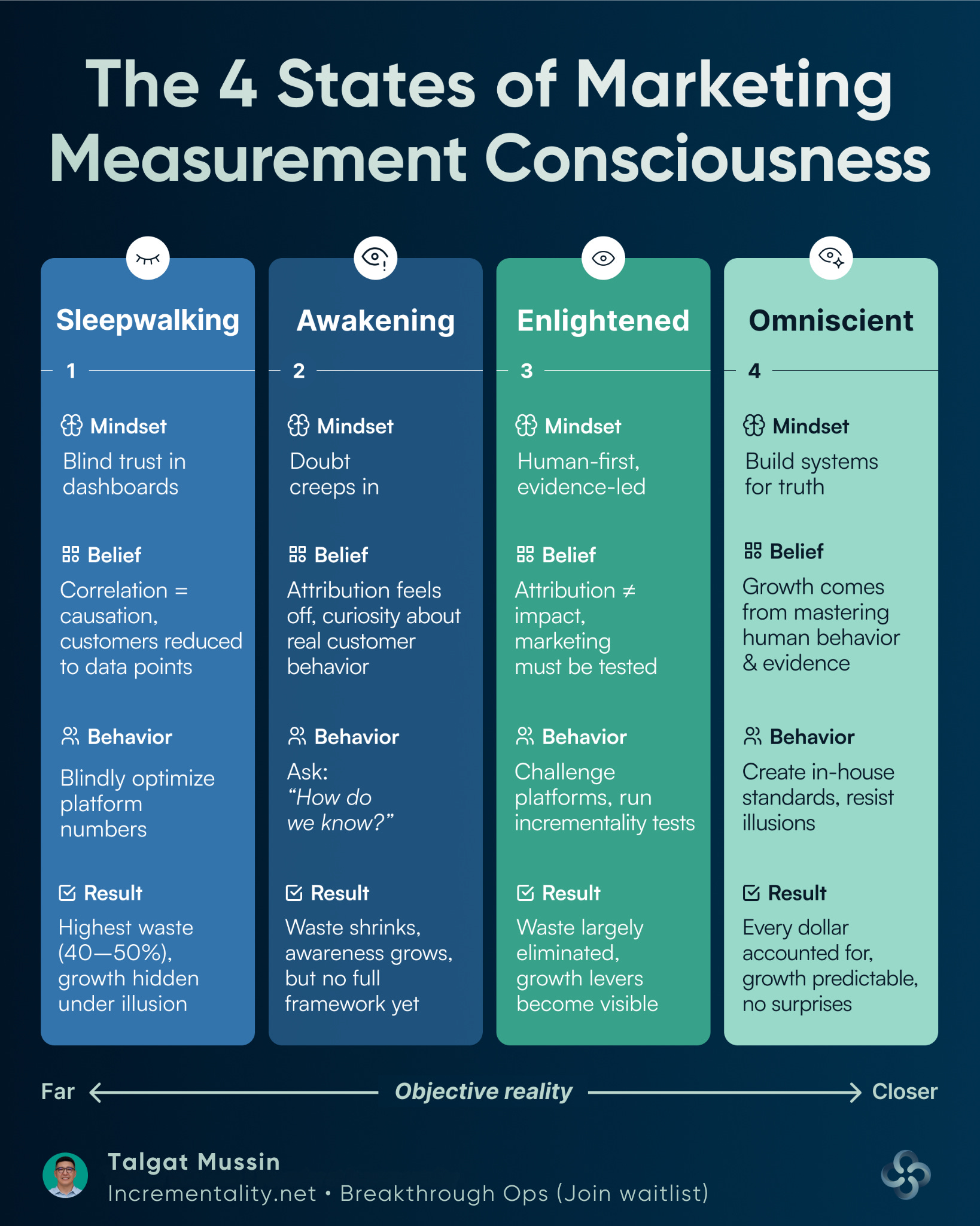 Stage 3 is where transformation happens. You stop treating attribution as truth. You test everything. You measure what actually moves the needle. You know your baseline.